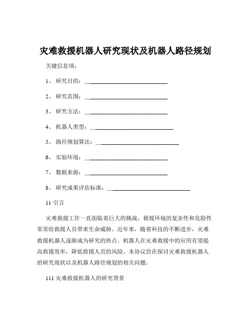 灾难救援机器人研究现状及机器人路径规划关键信息项:1、研究目的:____________________________2、研究范围:____________________________3、研究方法:____________________________4、机器人类型:____________________________5、路径规划算法:____________________________6、实验环境:____________________________7、数据来源:____________________________8、研究成果评估标准:____________________________11 引言灾难救援工作一直面临着巨大的挑战,救援环境的复杂性和危险性常常给救援人员带来生命威胁。