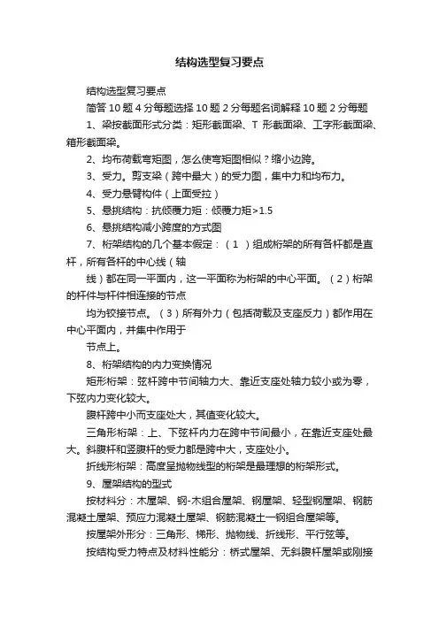 建筑结构选型知识点建筑结构选型是建筑设计中的重要环节,涉及到建筑物的稳定性、安全性、经济性等方面。