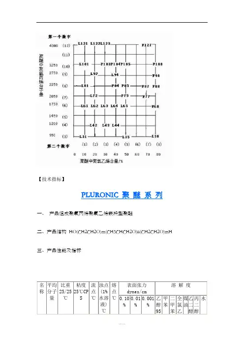 【技术指标】PLURONIC 聚醚系列一、产品组成聚氧丙烯聚氧乙烯嵌段型聚醚二、产品结构HO(CH2CH2O)m(CH3CHCH2O)n(CH2CH2O)mH三、产品性能及指标名称平均分子量比重25/25℃粘度25℃CPS流点℃浊点(1%水溶液)℃熔点℃表面张力dynes/cm溶解度0.10%0.01%0.001%乙醇95甲苯二甲苯全氯乙煤油乙二醇丙二醇水国产牌号对照组成:聚氧乙烯、聚氧丙烯嵌段聚合物英文名称:polyether L61、L62、L64结构式:HO(C2H4O)a-(C3H6O)b-(C2H4O)c-H类型:非离子型【性能与应用】1、作低泡沫洗涤剂或消泡剂。