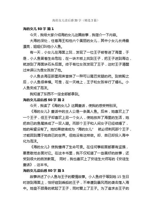 读海的女儿有感50字篇1今天我读了《海的女儿》这个故事,故事中讲了海王有六个美丽的女儿,其中小女儿长的最美丽,她的名字叫:“小人鱼”。
