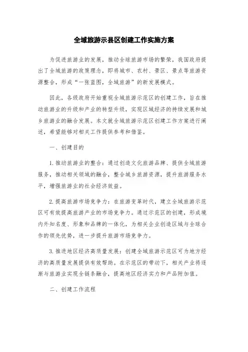 “全域旅游示范县”创建工作实施方案一、总体要求在实施全域旅游示范县创建工作中,以乡村旅游为核心,充分发挥全域旅游的引领作用,促进县域旅游资源整合,提升旅游产品和服务质量,推动乡村振兴和经济发展。
