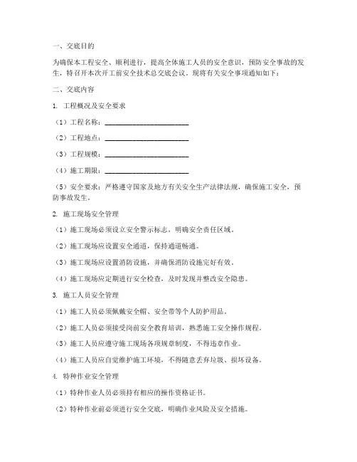 现将有关安全事项通知如下:二、交底内容1. 工程概况及安全要求(1)工程名称:________________________(2)工程地点:________________________(3)工程规模:________________________(4)施工期限:________________________(5)安全要求:严格遵守国家及地方有关安全生产法律法规,确保施工安全,预防事故发生。