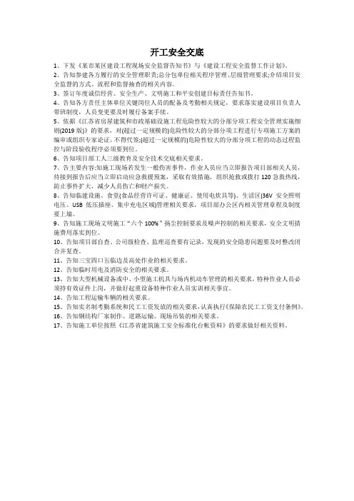 开工安全交底1、下发《某市某区建设工程现场安全监督告知书》与《建设工程安全监督工作计划》。