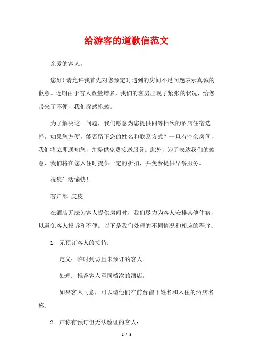 给游客的道歉信精选给游客的道歉信范文篇一:游客朋友们:龙峪湾景区致力于打造省内乃至全国最具影响力的5a级景区、以国家公园和国家山地旅游度假区建设为最终目标,20xx年项目计划总投资5亿元,主要建设包括“中原第一峰、空气超市、鸟窝部落、北欧森林婚庆蜜月基地、特色森林酒店、特色养生别墅、高山巨龙滑水道、河南低空旅游总部基地、河南航空旅游俱乐部,国际自驾营地、户外运动中心、森林艺术之家、森林通话世界”等十二个规划建设工程。