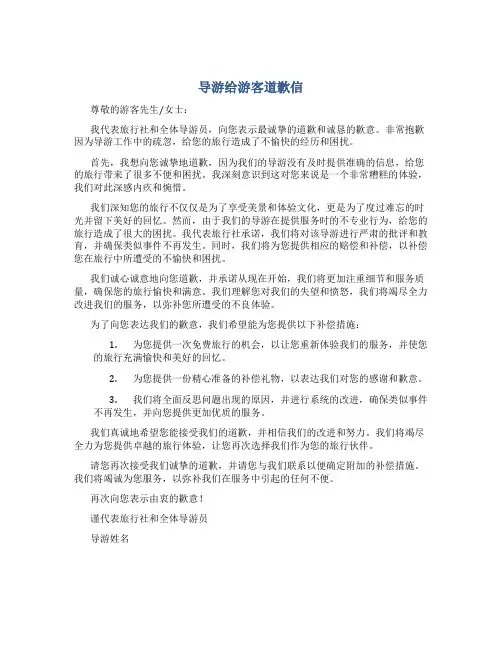 再次对给您带来的不便表示最衷心的歉意!祝愿您在以后的旅行中,能够尽情享受美好的风景和愉快的时光!谢谢!导游:XXX导游道歉信范文(二)亲爱的旅游者:首先,我谨代表我们导游团队向您表示最诚挚的歉意和诚恳的道歉。