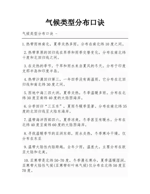 气候类型分布口诀1.热带雨林南北,夏季炎热多雨。