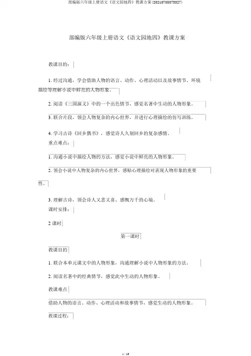 《语文园地四》教学设计教材解析这是部编版教材六年级上册第四单元的语文天地,内容上包含了交流平台、词句段运用、以及日积月累三个大的板块。