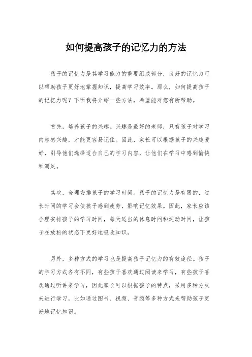 如何提高孩子的记忆力的方法孩子的记忆力是其学习能力的重要组成部分,良好的记忆力可以帮助孩子更好地掌握知识,提高学习效率。