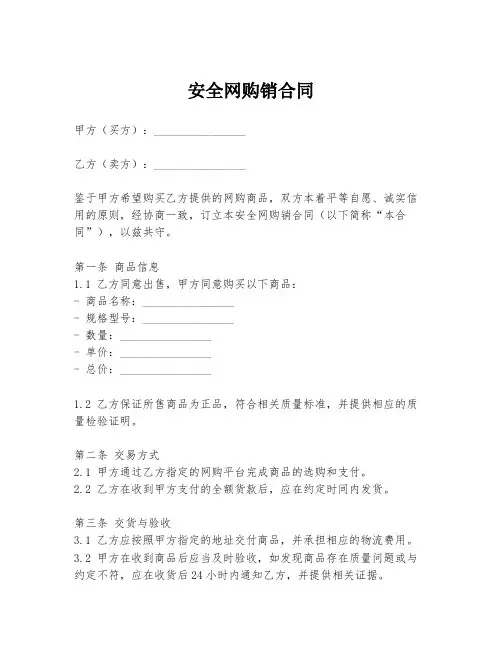 安全网购销合同甲方(卖方):_____________________乙方(买方):_____________________鉴于甲方是依法成立的企业,拥有合法的经营权和销售权,乙方有购买甲方商品的需求,甲乙双方本着平等自愿、诚实信用的原则,就乙方通过互联网平台向甲方购买商品事宜,经协商一致,订立本安全网购销合同(以下简称“本合同”),以资共同遵守。