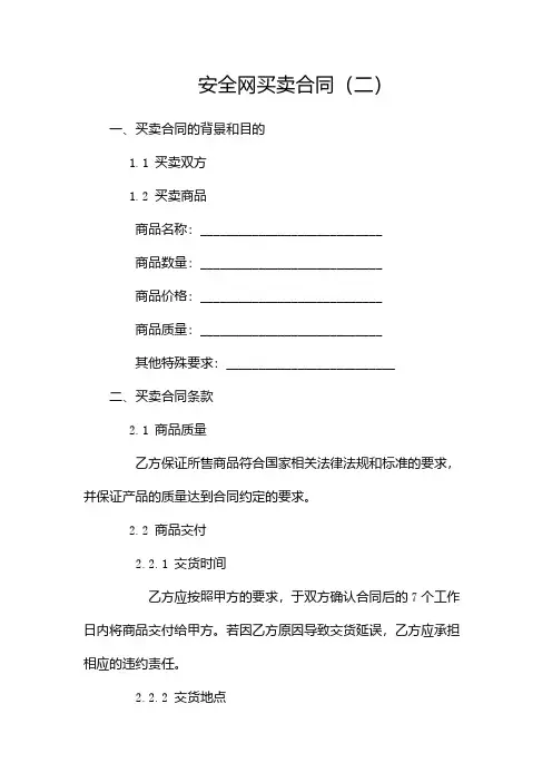安全网买卖合同(二)一、买卖合同的背景和目的1.1 买卖双方1.2 买卖商品商品名称:____________________________商品数量:____________________________商品价格:____________________________商品质量:____________________________其他特殊要求:__________________________二、买卖合同条款2.1 商品质量乙方保证所售商品符合国家相关法律法规和标准的要求,并保证产品的质量达到合同约定的要求。