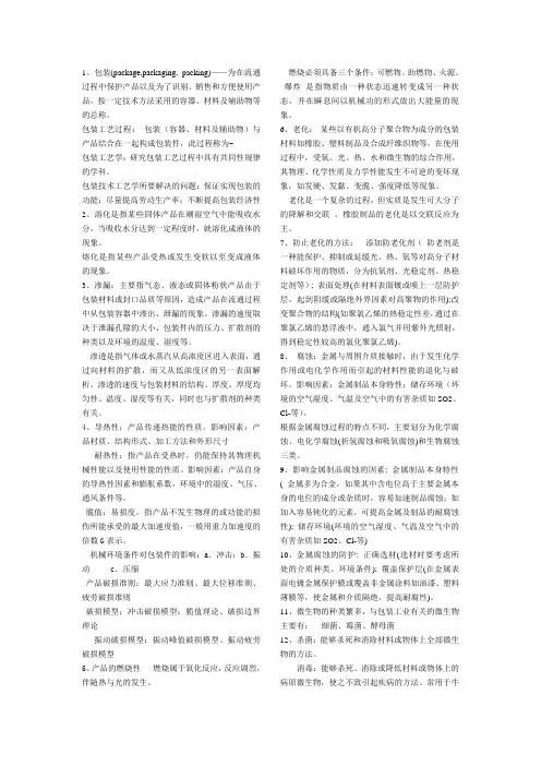 1.什么是包装、包装工艺过程、包装工艺学包装:为在流通过程中保护产品、方便储运、促进销售,按一定技术方法而采用的容器、材料及辅助物等的总称。