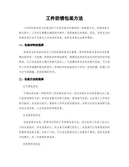 二、包装方法的选择1.气调包装法气调包装法是一种常用的工件防锈包装方法。