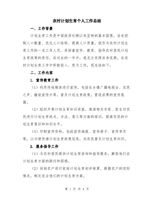 农村计划生育个人工作总结一、工作背景计划生育工作是中国政府长期以来坚持的基本国策,旨在控制人口数量、优化人口结构、提高人口质量。