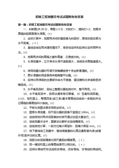 测量员考试一试题及答案初级工程测量员考试一试题附有有答案一、判断题(共 30 分,每题1.5 分,对的打√,错的打× )、l地面点高程的起算面是水平面。