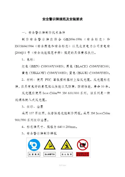 制作安全警示牌应符合GB2894-1996《安全标志》和ISO3684:1984《安全颜色和安全标志》以及北京电力公司京电安[2006]11号《安全设施规范手册》规定的具体要求执行。