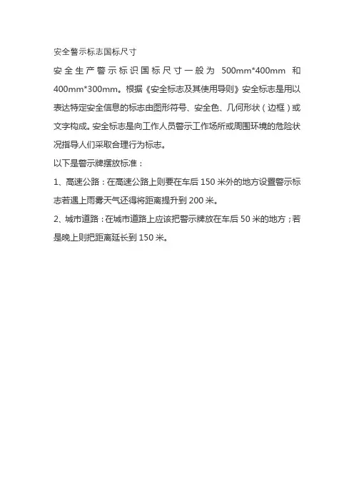 二、安全标识标牌的尺寸规定1. 标志牌基本尺寸(1)禁止标志牌、警告标志牌、指令标志牌尺寸均为300mm×400mm。