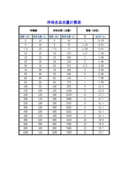86/5(度温差)水流量计算1、.冷却冷却水流量水流量:一般按照产品样本提供数值选取,或按照如下公式进行计算,公式中的Q为制冷主机制冷量L(m3/h)= [Q(kW)/(4.5~5)℃x1。