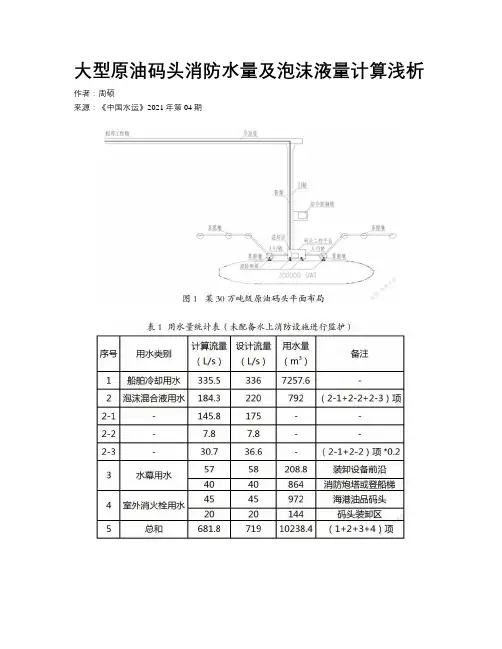 大型原油码头消防水量及泡沫液量计算浅析作者:***来源:《中国水运》2021年第04期摘要:以某海港30萬吨级原油码头设计项目为案例,根据工程经验及现行规范,对大型原油码头消防水量及泡沫液量的计算过程进行叙述,为此类工程的消防计算提供参考。