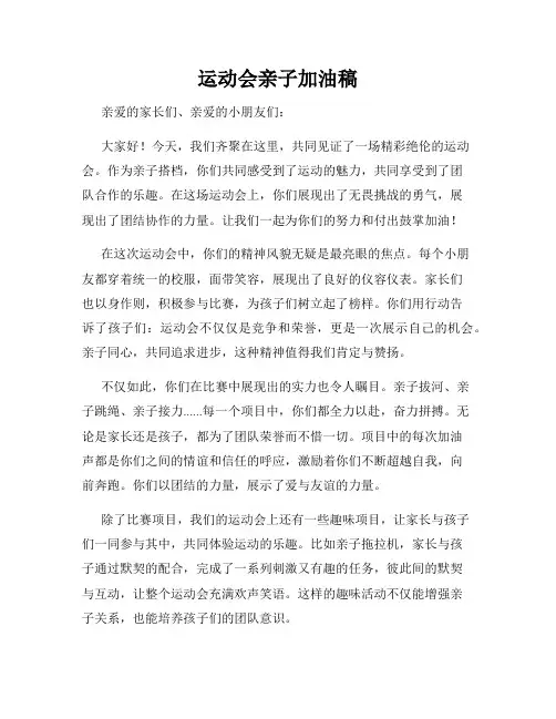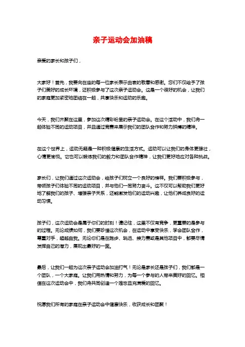 亲子运动会加油稿亲子运动会加油稿精选2篇(一)亲爱的家长和孩子们,大家好!首先,我要向在座的每一位家长表示由衷的敬意和感谢。