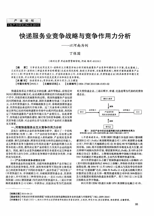 国营快递服务业竞争战略与竞争作用力研究一、引言快递服务业作为现代物流业的重要组成部分,承担着商品流通的关键环节,是经济发展的重要支撑产业。