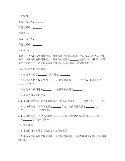合同编号:_______甲方(卖方):_______身份证号码:_______联系电话:_______乙方(买方):_______身份证号码:_______联系电话:_______根据《中华人民共和国合同法》及相关法律法规的规定,甲乙双方在平等、自愿、公平、诚实信用的原则基础上,就甲方出售位于_______的房产(以下简称“标的房产”)给乙方,乙方购买该房产事宜,经友好协商,达成如下协议:一、标的房产的基本情况1.1 标的房产位于_______,具体地址为_______。