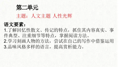 2.主题解说作者通过对在日本留学期间同藤野先生交往的生活片段的回忆,赞扬了藤野先生正直热诚、治学严谨、没有狭隘的民族偏见的高尚品质,表达了作者对藤野先生真挚和深切的怀念。