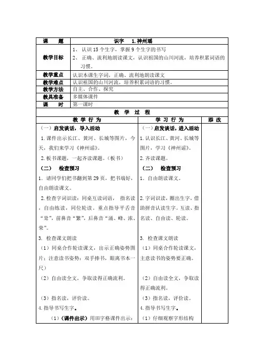 【教学目标】知识与能力1.会读“州、华”等15个生字、会写本课“州、华”等9个生字,会写“神州、中华”等10个词语,积累“华夏儿女、炎黄子孙”等8个词语。