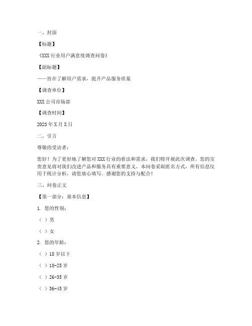 一、封面【标题】《XXX行业用户满意度调查问卷》【副标题】——旨在了解用户需求,提升产品服务质量【调查单位】XXX公司市场部【调查时间】2023年X月X日二、引言尊敬的受访者:您好!为了更好地了解您对XXX行业的看法和需求,我们特开展此次调查。