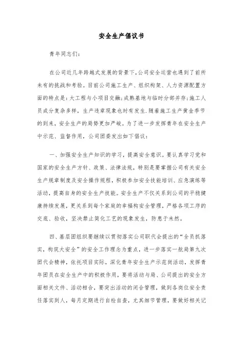 安全生产倡议书例文广大团员青年:___年广大团员青年在各自的岗位上充分发挥先锋模范作用,带头学技术、保安全,为全厂安全生产平稳运行做出了积极的贡献。