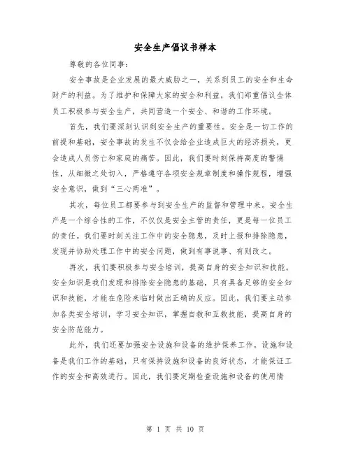 安全生产倡议书样本尊敬的各位同事:安全事故是企业发展的最大威胁之一,关系到员工的安全和生命财产的利益。