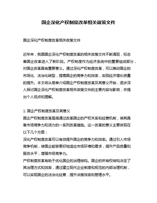 国企深化产权制度改革相关政策文件国企深化产权制度改革相关政策文件近年来,我国国企深化产权制度改革的相关政策文件不断涌现,标志着国企改革进入了新阶段。