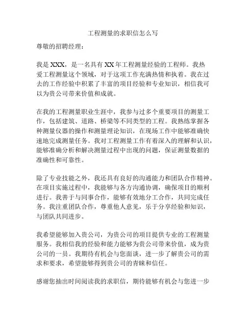 测量员个人简历求职信尊敬的招聘经理,您好!我是XXX,来自XXX大学土木工程专业,即将毕业。