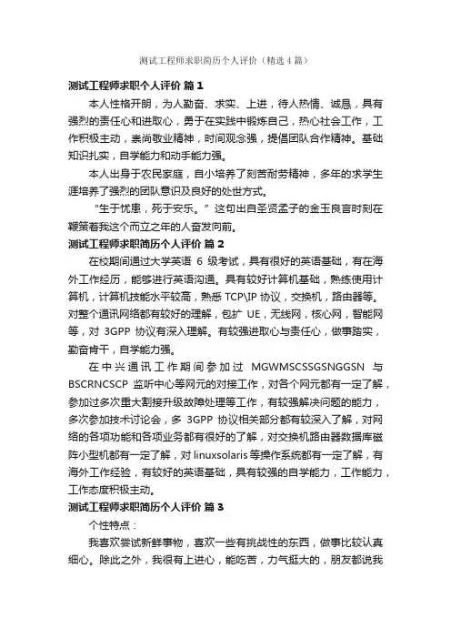 测试工程师个人简历范文姓名:乾先生性别:男婚姻状况:未婚民族:汉族户籍:湖北-荆州年龄: 23现所在地:江苏-常州身高: 166cm希望地区:广东-东莞、广东-江门希望岗位:电子/电器/元件类-电子工程师/技术员电子/电器/元件类-电池/电源开发工程师教育经历2021-09 ~ 2021-07 湖北第二师范学院机电一体化大专 **公司 2021-09 ~ 2021-11公司性质:私营企业行业类别:机械制造、机电设备、重工业担任职位:电子测试工程师岗位类别:电子测试工程师工作描述: a.制定实验室测试仪器操作指引b.指导技术员制定工作日计划c.改善测试流程及完善测试数据d.监督好测试是否按计划正常进行e.更新好测试日报表f.反思当日工作不足并思考弥补方法**公司 2021-01 ~ 2021-09公司性质:外资企业行业类别:机械制造、机电设备、重工业担任职位:高级测试技术员岗位类别:电子工程师/技术员工作描述: a.根据测试申请单提供的信息领取测试样板充电器,电池和主机b.理解申请人所需测试的目的及测试程序c.根据测试所需用到测试仪器做好准备工作并做好测试的时间表d.进行测试,监督测试以及更新测试进度e.及时向工程提供测试过程中所出现的问题f.测试完成后出测试报告离职原因:寻找好的发展平台项目经验Ryobi P104 P105 P107 P108 电池包 2021-04 ~ 2021-08担任职位:高级测试技术员项目描述:该项目为公司特大出口订单项目,且从开发到出货时间极短。