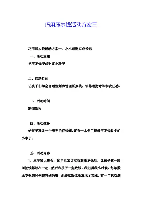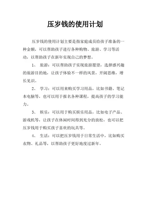 三、使用方案1. 压岁钱用途规定压岁钱必须用于孩子们的学习、生活和娱乐等方面,不能挥霍浪费或者用于其他不当用途。