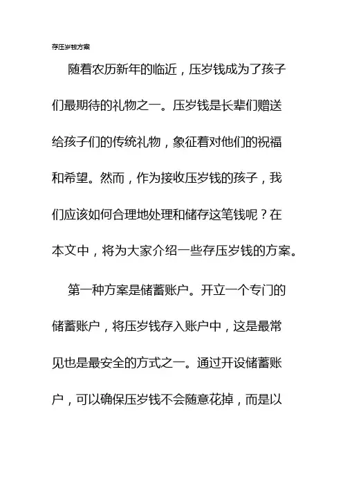 压岁钱去向方案引言每年过年的时候,孩子们都会期待着父母、长辈们给予的压岁钱。