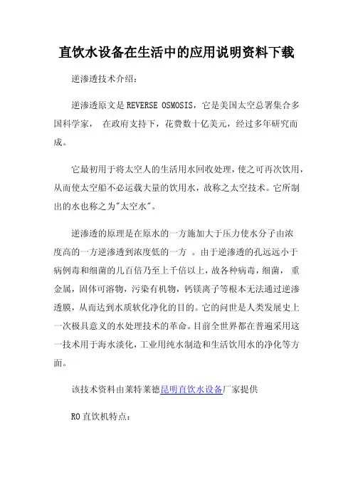 二、直饮水机的工作原理直饮水机主要通过以下几种技术来提高水的质量:1.预处理:这个过程包括去除水中的悬浮物、泥沙等大颗粒物质,通过安装过滤器来实现。