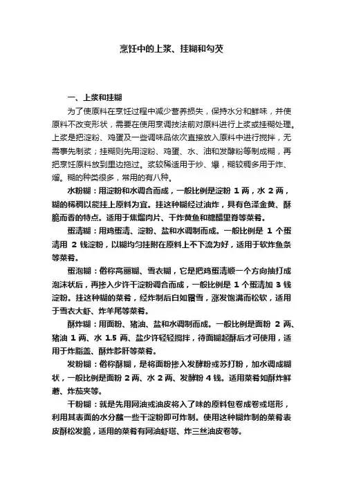 烹饪中的上浆、挂糊和勾芡一、上浆和挂糊为了使原料在烹饪过程中减少营养损失,保持水分和鲜味,并使原料不改变形状,需要在使用烹调技法前对原料进行上浆或挂糊处理。