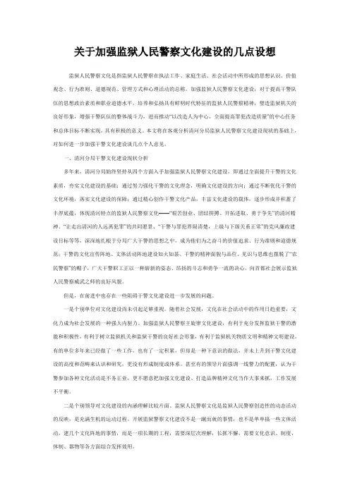 关于加强监狱人民警察文化建设的几点设想监狱人民警察文化是指监狱人民警察在执法工作、家庭生活、社会活动中所形成的思想认识、价值观念、行为准则、道德规范、管理方式和心理活动的总称。