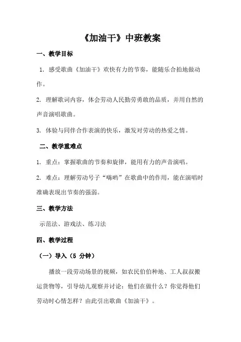 幼儿园中班音乐活动《加油干》教案一、活动目标1. 认知目标:让幼儿通过歌曲《加油干》了解劳动的重要性和快乐,培养幼儿热爱劳动的情感。