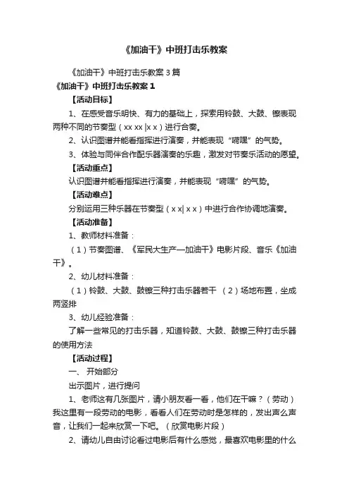 中班打击乐活动教案《加油干》一、活动目标1. 认知目标:让幼儿了解和体验打击乐的基本音色和节奏,培养幼儿对打击乐的兴趣。