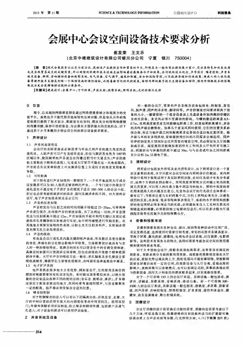 全国总工会国际交流中心CONCENT设备设计方案完整文档(可以直接使用,可编辑完整文档,欢迎下载)全国总工会国际交流中心扩音系统工程技术方案技术资料版权所有未经许可请勿外传设计:北京市科裕信达工程技术设备代理商:北京市科裕信达工程技术地址:北京丰台区大成路6号金隅大成时代D座1604网址: :目录1 概述 (4)2. 扩声系统工程设计理念 (5)3. 扩声系统工程规划 (5)4. 扩声系统设计依据 (6)5. 综合会议厅扩声系统声学特性指标 (7)6. 对建声要求 (8)7. 音控室技术要求 (12)8. 扩声系统设计 (13)9. 扩声系统主要设备配置 (21)10. 工程保障 (26)11. 技术服务 (27)12. 服务方案 (27)13. 部分成功案例 (29)1 概述全国总工会国际交流中心以综合性会议、演出为主,满足大型会议、大型报告会兼顾戏剧、歌剧、舞剧等各种类型演出的使用。
