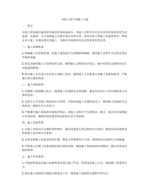 市政工程文明施工方案一、前言市政工程是城市建设和发展的重要组成部分,其施工过程中往往会对周边环境和居民生活造成一定影响。