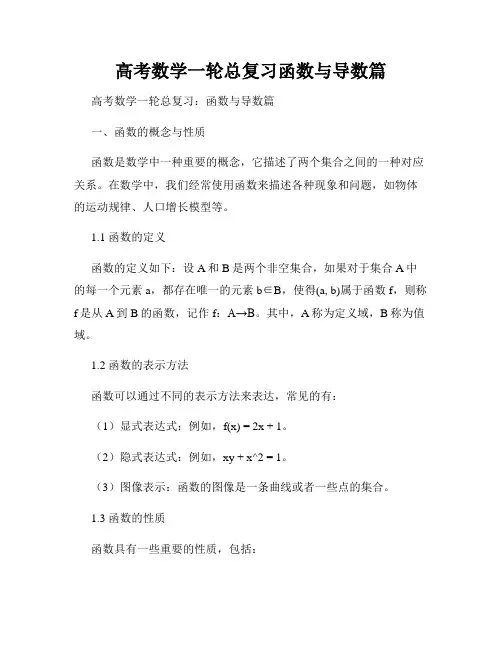 高考数学一轮总复习函数与导数篇高考数学一轮总复习:函数与导数篇一、函数的概念与性质函数是数学中一种重要的概念,它描述了两个集合之间的一种对应关系。