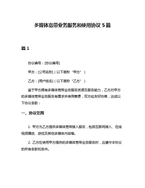 多媒体宽带业务服务和使用协议5篇篇1协议编号:[协议编号]甲方:[公司名称](以下简称“甲方”)乙方:[用户姓名](以下简称“乙方”)鉴于甲方拥有多媒体宽带业务服务资源及服务能力,乙方对甲方的多媒体宽带业务服务有需求并使用意愿,双方经友好协商,达成以下协议条款:一、协议范围1. 甲方为乙方提供多媒体宽带接入服务,包括互联网接入、在线视频播放、游戏及其他多媒体内容等。
