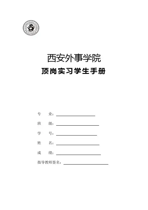 西安外事学院顶岗实习学生手册专业:班级:学号:姓名:成绩:指导教师签名:西安外事学院教务处印制西安外事学院高职学生顶岗实习承诺书为了加强社会实践锻炼,提高专业技能和就业竞争力,确保本次实习能够安全顺利地完成,本人自愿郑重承诺如下:1.本人将严格遵守西安外事学院顶岗实习有关规定,未经学校和二级学院审核批准不擅自离校。
