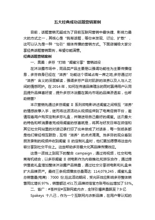 经典话题营销案例一、奥美:多芬“打响“闺蜜分享”营销战役在沐浴露市场中,同品类产品主要是以强调功能性为主要传播信息,多芬自身已经在“滋养”功能这个领域占有一席之地;多芬通过对“滋养”含义的深层解读,强调多芬产品对肌肤的滋养以及人与人之间的情感呵护。