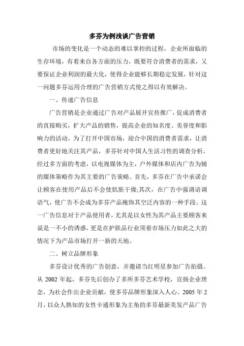 多芬为例浅谈广告营销市场的变化是一个动态的难以掌控的过程,企业所面临的生存环境,有着来自各方面的压力,既要符合消费者的需求,又要保证企业利润的最大化,使得企业能够长期稳定进展,针对这个问题多芬使用合理的广告营销方式使之得以有效解决。