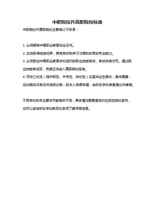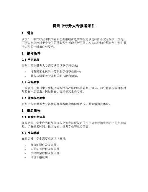 2. 报考条件2.1 学历要求贵州中专生报考大专需要满足以下学历要求:•持有国家承认的中等职业学校毕业证书;•具备与所报考专业相关的技能和知识。