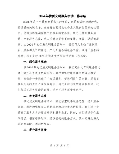 2024年文明优质服务的年度工作计划模版____年,为深入学习实践____,积极配合全区金融单位开展“自律、优质文明服务”活动,提高行政效能,进一步提升我单位服务水平,转变服务理念,提高群众对我单位工作的满意度,促进我单位持续稳定健康发展,结合全区金融单位实践,特制定本年度工作计划:一、重视服务水平,提高员工素质服务的关键是高素质的人才,员工的素质是提高服务质量的前提,是决定金融单位服务水平的高低和竞争能力的强弱。