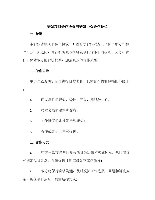二、合作内容2.1 甲方提供研发中心所需的场地、设备和资金支持。